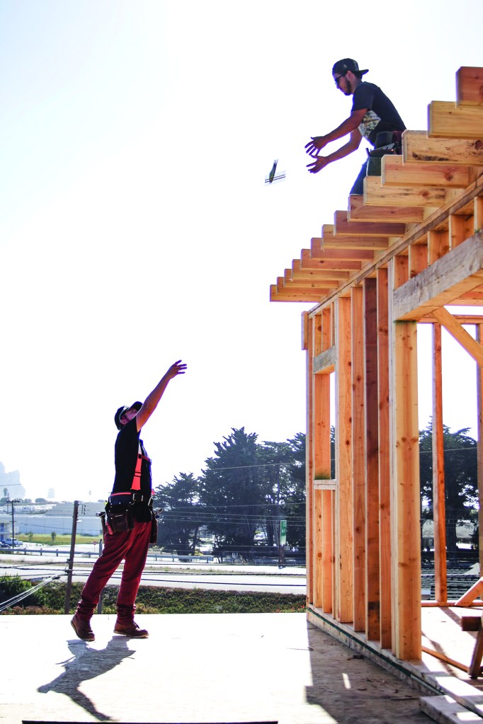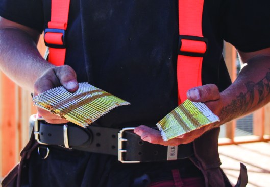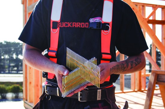 This is a simple trick that’s one of the first things we teach our new guys. When framing a building, you need to reload your nail guns (we run Hitachi stick nailers), and you can carry only so many nails in your bags without getting weighed down. But you can’t toss a bunch of sticks to a co-worker without them flying everywhere. Tossing one rack at a time doesn’t work either: First of all, it’s too slow, and more times than not, that one rack is going to break apart, and you’ll end up with a lot of pieces.