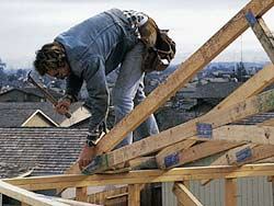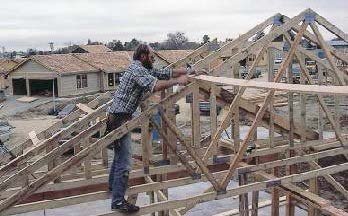 Figure 4. A carpenter nails off the top chord brace at the premarked layout line, automatically spacing the trusses. Note in the background how the outriggers have been installed in preparation for the barge rafters.
