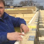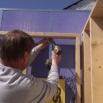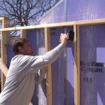 Contractor Rob Paisley fastens an aluminum breakaway clip to the wood wall frame of the new building. If the wall should catch fire, this clip would melt and allow the wall to fall away, leaving the protective gypsum board assembly intact and still fastened to the neighboring structure.
