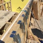 The yellow GP DensGlass gypsum board at right is protecting the walls of the two stairwells for the building, which also must be fire-rated assemblies. DensGlass was chosen for this assembly because of its weather resistance as well as its fire resistance, since the assembly must be left exposed to the weather for weeks during construction.