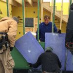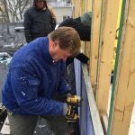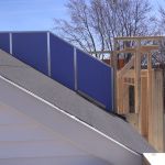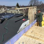 On a snowy day in spring, the crew constructs the gypsum-board and steel firewall assembly, working on the roof of the existing building next door. Later they will cover the firewall with framing and siding from this side and integrate it into the roof of the existing building.