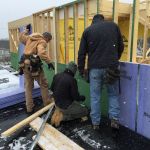 On a snowy day in spring, the crew constructs the gypsum-board a…