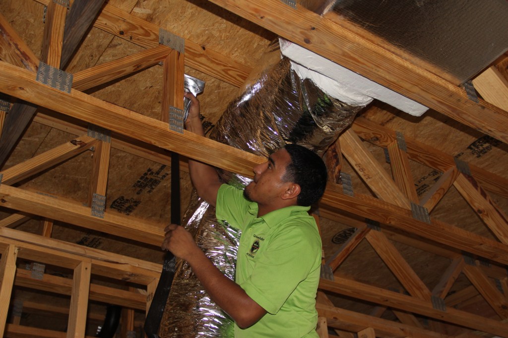 Installer Luis Ventura inserts a tap collar for a flex-duct connection to a duct board box.