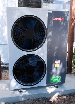 A monobloc system packages all the system components, including the fully-charged refrigerant components, electronics, and heat exchanger, in a single outdoor unit. The outdoor unit of a monbloc system (right) has a slightly wider cabinet to accommodate all the components compared with a comparable split-system.