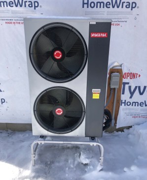 A split-refrigerant system has an outdoor compressor/evaporator unit (above left); it pipes compressed refrigerant to an indoor condensing unit (which is about the size of a typical wall-hung modulating condenser boiler; not shown in photo) that contains the refrigerant-to-water heat exchanger and all of the electronics and controls.