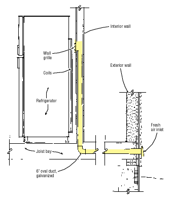 When the refrigerator is running, the waste heat from the coils tempers the incoming air, which in turn cools the coils and increases the efficiency of the refrigerator. When the refrigerator is cycled off, the inlet air doesn’t receive the benefit of additional heating, but because it flows into the narrow, out-of-the-way space between the refrigerator and the wall, the likelihood that the homeowner will detect a cold draft is reduced. “I’ve used the design on several houses and never had a comfort complaint,” Mitchell says.