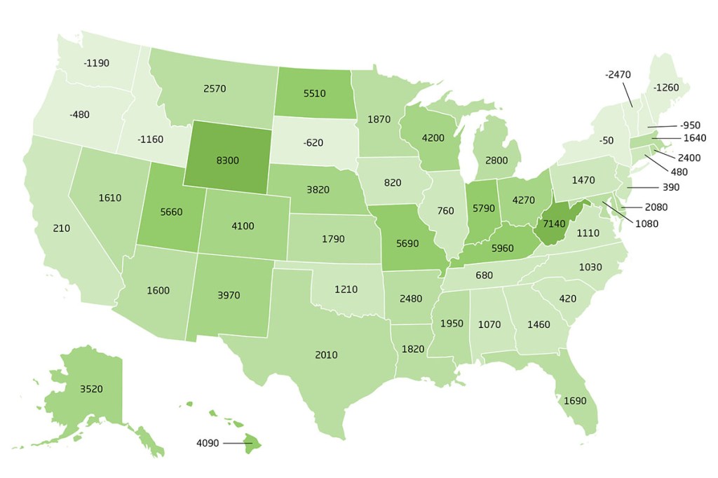 In the map below, we’ve calculated the impact on CO2e (the amount of greenhouse gases that have an impact equivalent to CO2) of switching from an electric storage tank water heater to a propane condensing tankless water heater in each state.
