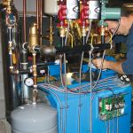 Flue requirements. The noncondensing Buderus boiler can be vented directly to a lined masonry chimney with a correctly sized flue. But because the existing chimney flue was oversized, we installed a 5-inch-diameter stainless steel chimney liner to guarantee a good draft and avoid potential corrosion problems from any flue gases condensing inside the chimney. Installing the liner accounted for about $1,300 of the project’s overall cost. To help ensure proper draft, the exhaust flue is fitted with a barometric damper.