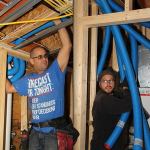 In this composite split image, Placetailor carpenter Diego Gutierrez (left) guides air lines through the ceiling framing while project manager Travis Anderson (right) pulls the lines into place at the Air Pohoda heat exchanger and air handler.