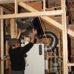 Travis Anderson places a distribution manifold manufactured by Zehnder on top of the Air Pohoda ERV unit. The designers combined components from Zehnder and Air Pohoda for this installation.
