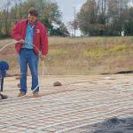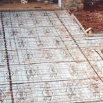 Day 2, Morning. Heating crew uncoils the PEX tubing and attaches it to the wire mesh grid, using plastic cable ties. It’s important to be on the lookout for sharp points and rough edges in the wire: These should be avoided or knocked flat.