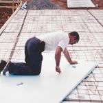 Day 1, Afternoon. Laborers lay down high-compression-strength extruded polystyrene (XPS) insulation over the stone base. On top of that, they lay flat sheets of 10-gauge welded wire mesh, which creates a 6-inch grid for strapping the tubing in place.