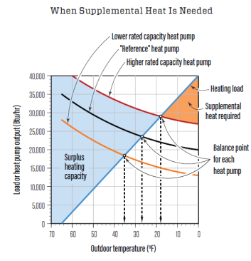 The heating load of any building increases as the outdoor temperature drops. Unfortunately, the heat output of any air-source heat pump decreases as the outdoor temperature drops. This effect is illustrated in the chart above. The heating-load line crosses the heat pump’s heating-capacity line at a “balance point.” This is where the building’s heat loss is the same as the heat pump’s output. At warmer outdoor temperatures, the heat pump has more than sufficient capacity to heat the building. At outdoor temperatures below the balance point, some type of supplemental heat input is needed to maintain the desired comfort temperature in the building. This is where that existing boiler comes in. It can operate along with the heat pump to ensure sufficient heat delivery to the building.