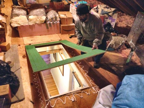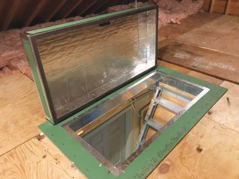 Oftentimes, taking on a remodeling project on one part of a client’s house will lead to a completely different project on another part of the house. That was the case with the insulated hatch cover described in this article. I was in the process of fixing some rot-damaged garage framing and doors in my clients’ 1960s split-level home when they mentioned that they also had a problem with the drop-down stairs leading up to the attic. Even though the stairs had been recently replaced, the ceiling opening was still very drafty. To block the cold air leaking into their upstairs hallway, they had tried cobbling together a hatch cover using rigid foam and scrap lumber, but this solution wasn’t particularly effective. They were hopeful that I could cap the stairs with an insulated, airtight cover that wouldn’t block access to the attic.