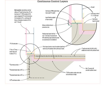 As I mentioned, one of our design rules is to maintain continuity of the control layers around the entire house, including floors, walls, and roofs. That rule applies not just to the insulation (the thermal control layer), but also to the control layers for vapor, bulk water, and air infiltration.