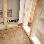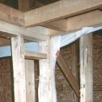 In a home with a bearing wall, where it’s not possible to install the ceiling poly in one piece, we install it room by room. Each partition needs to have a strip of poly above the top plate, and any penetration of the ceiling poly needs to be carefully sealed with tape or aerosol foam.