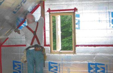 The 5 1/2-inch-wide gasket is designed to provide a positive seal under a heavy structural load; it also serves as a moisture barrier between the concrete and wood. After setting, stringing, and squaring the rim joists, we run a bead of construction adhesive over the joint between rim and mudsill. We’ve tried EPDM gaskets under the rim, but they tend to get in the way. Adhesive is less expensive and nearly as effective. It’s important to take this step before rolling the floor joists into position; otherwise, rim sealing becomes a long, hard slog. Glue-and-nail subfloor installation has become standard industry practice. However, not everyone glues the edge of the rim joist on the assumption that the walls hold the subfloor down at the edges. In fact, this is a common point of air entry, which we handle with a continuous bead of adhesive. We frame and sheathe the walls on the deck before standing them on a rubber gasket tacked around the perimeter of the deck. I buy my gaskets from Resource Conservation Technology (410/366-1146, www.conservationtechnology.com) and Denarco (269/435-8404). These companies carry a good selection of gaskets designed for sealing a variety of framing configurations.