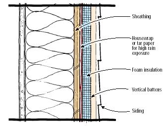 Housewrap or asphalt felt is useful to control rainwater that penetrates the siding. In locations with high exposure to wind-driven rain, it may be necessary to install tar paper or housewrap behind foam sheathing to help control any rainwater that penetrates the siding.