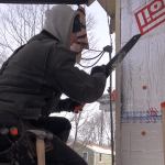 Carpenter Shane Fenton applies 3M 8067 flashing tape to the Grace membrane on a wall and wraps the tape around the corner to complete the seal. The 3M tape stays flexible and sticky at surprisingly cold temperatures, but the crew needs to work without gloves when applying tape, in spite of the bitter cold weather.