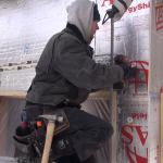 Creating the airtight barrier under the insulation on the house wall requires meticulous hand labor and attention to detail.