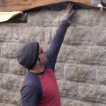 Mitchell trims the edge of the insulation sheet with a knife. Corners and eaves create challenging and laborious detail work on this project.