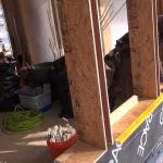 Muennich uses a 6-foot level to check the alignment of three side-by-side window bucks as the crew builds out the wall.