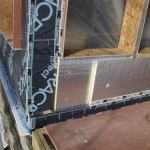 Another cutaway view of the air barrier, insulation, and window buck detail. 3M 8067 tape has been used to seal the building corner joint in the air barrier membrane, and to seal the air barrier to the window bucks. “The window bucks are part of the air barrier,” explains Pollard. Around the corner on the wall at left, window bucks have just been set and the foam installation has not yet started in this photo.