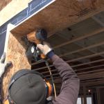 Carpenter Chris Mitchell cuts a notch in a sheet of foil-faced polyiso foam in order to fit the foam neatly around a roof rafter tail. Thompson Johnson has opted to fit the insulation and air seal around the existing rafter tails for this job, rather than cut the tails off and run the air barrier continuously up the walls onto the roof.