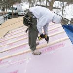 After patching the remaining areas of damaged sheathing, we began installing foam, working from the ridge down. We quickly fastened the rigid sheets to the sheathing with 2 1/2-inch-long Duro-Last HD screws and washers (800/248-0280, duro-last.com), using four to six fasteners per sheet. Because the sleepers would hold the foam sheets securely in place once they were installed, we needed only enough fasteners to keep the foam from slipping while we walked on it. To ensure that the blanket of rigid foam was as continuous as possible, we carefully sealed all of the joints between the sheets and around penetrations with low-expansion canned spray foam.