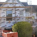 I also sometimes recommend housewraps like Tyvek or Typar, particularly for projects in the rainy season. Felt paper that gets wet tends to bubble out between fasteners, and shingling over bubbled paper can lead to cracked and split shingles. Housewraps don’t have this problem, so the entire house can be wrapped and kept reasonably dry. To prevent cedar extractives from bleeding onto the underlying housewrap, I always overlay the wrap with a single ply of Grade D paper as we shingle.