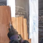 Once the second course has been fastened, we stack a second board onto the top edge of the first board, which sits proud of the face of the shingles, and repeat the process. As we work up a wall section, we’ll stack as many as five boards at a time, though three boards seems to be about average.