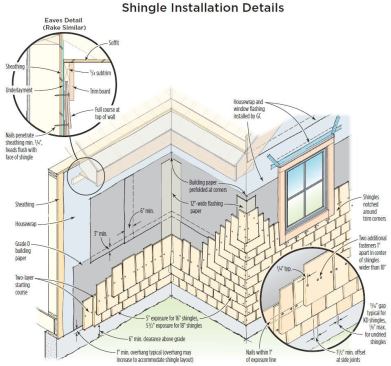 Underlayment. A weather-resistive barrier beneath the siding provides an extra layer of protection against extreme weather and is required by most state and local codes. Most of the time, we use a double layer of Fortifiber’s Super Jumbo Tex 60-minute Grade D building paper (800/ 773-4777, fortifiber.com). This asphalt-impregnated kraft paper isn’t as thick or as heavy as ASTM D226-rated Type 1 asphalt felt (about 6 pounds per square vs. 12 pounds per square), but it’s less brittle in cooler weather and is flexible enough to sharply crease for inside and outside corners. We’ve found that in our climate, the double layer of felt paper is just as effective as rain-screening at allowing the back of the shingles to dry out. To prevent the paper from getting wet, we install only as much as we can cover with shingles that same day.