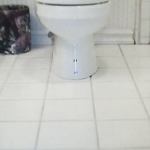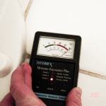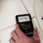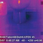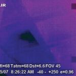 The dark spot in the infrared scan of the ceiling helped to pinpoint the source of the water. Upstairs, we found that this coincided with the location of the toilet. As you can see in the thermal image, there’s a darker area on right side of the toilet. A moisture meter confirmed that the floor around the toilet was soaked. We made some measurements downstairs and found that the wet spot in the office was 55 inches from the outside wall — the same distance as the right-hand toilet bolt. In questioning the owner about use of the bathroom, we learned that in fact the house cleaner flushed this toilet as part of her weekly cleaning — a seven-year mystery solved.