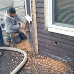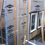 The first step was to have a cellulose contractor dense-pack the uninsulated 2×4 wall cavities from the exterior (see slideshow). Then, after stripping off several layers of existing siding, we covered the 7/8-inch board sheathing with a carefully lapped and taped layer of HardieWrap weather barrier. To head off air infiltration between the framing members in the window openings, we also lined the rough openings with strips of HardieWrap, which we sealed to the housewrap outside and to the interior plaster on the inside.