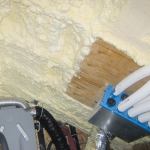 The outer layer of foil facing serves as the drainage plane and a primary air barrier; the housewrap, now buried under 5 inches of rigid foam, acts as a secondary air barrier.