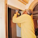 Following the InvisiDoor instructions, I screwed the plates to the head jamb and to the floor using the slotted holes in the hinge plates, which allow for tweaking a cabinet’s position once it has been hung. The floor plate has a pivot pin and the bottom plate on the cabinet has a hole that fits over the pin. At the top, the jamb plate has a threaded opening that accepts an Allen-head cap screw that threads through a hole in the top plate of the cabinet and acts as a top pin.