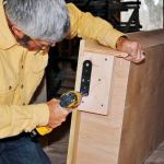 The key was finding the right hinge mechanisms. I decided to try the InvisiDoor Hinge Kit from Custom Service Hardware, which I had seen at several trade shows. The kit consists of two pairs of plates—one for the top of the cabinet and one for the bottom—that work for either an in-swing or an out-swing cabinet. For this project, I needed an out-swing configuration.
