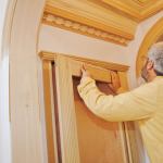 For the built-up head trim, I started with flat stock thick enough and long enough to project about 1/4 inch beyond the pilasters in both dimensions. I wrapped it with panel mold and added a top cap. The thickness of the trim hid most of the gap at the top, and I added a thin strip to the cabinet to cover the rest. At the cabinet bottom, I coped a relief path in the plinth block on the hinge side so the cabinet door could open without binding on the base molding.