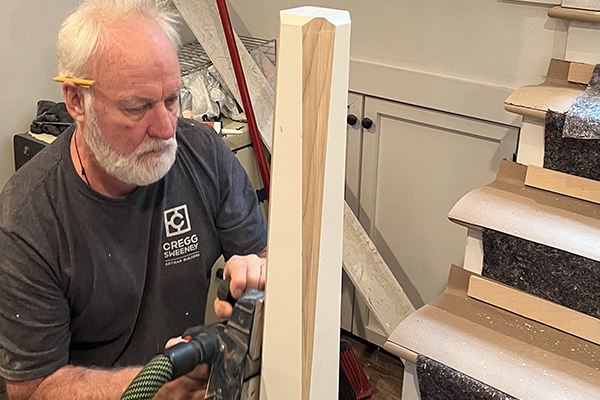 Due to the tapered interior of my newel sleeves, they weren’t going to slide right down onto the bases. First, I had to taper the old posts, which was easily done using a power plane and about 20 passes per corner. I slathered the post with adhesive and dropped the sleeve into place on the base. This left about 6 inches of old post projecting, enough to capture the cap pieces with more adhesive. I used trim-head screws to hold everything plumb while the glue cured.