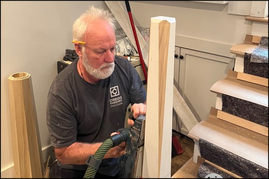 With the original handrail removed, the old posts had some movement, but the new glued-in bases did a remarkable job of stiffening the entire assembly. The final railing system includes cable rail, to follow painting—still a couple of months out as of this writing. I charged $625 per newel, plus installation.