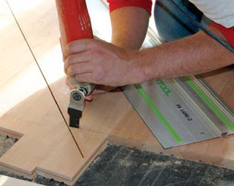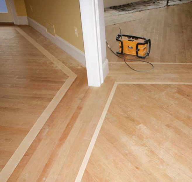 Our lead carpenter came up with a better approach. We installed the field flooring first, running the ends rough to within a few inches of the walls and taking care not to nail within the border zone. Once all four fields were completed, we snapped reference lines for the borders. Then we simply laid our newly acquired Festool plunge-cut saw and guide rail (888/337-8600, festoolusa.com) on the lines and cut the edges clean.
