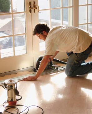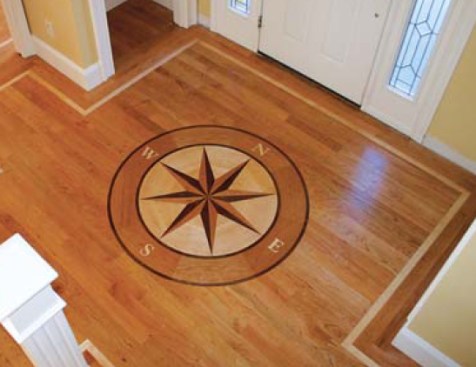 In the entry hall, an inlaid compass-rose medallion prefabricated by Oshkosh Designs (877/582-9977, oshkoshdesigns.com) put the icing on the cake. The inlay came with a prepared routing template and router bit, simplifying its installation. As with the borders, we were careful to keep nails out of the 4-foot-diameter inlay area.