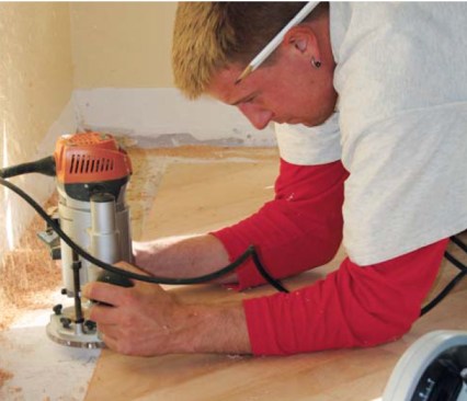 Next, we ran a router equipped with a stacked pair of wing cutters along the sawn edges, creating a groove for the tongued maple inlay strip. We had to replace the locking nut on the router with a thinner version—and even then we cleared the subfloor by only about 1/16 inch.