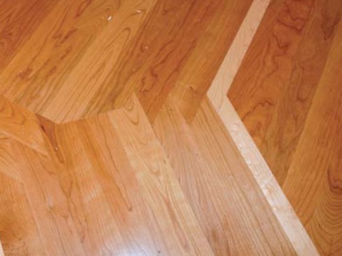 We prepared the maple strips back at the shop, using a table saw with a stacked and spaced dado blade to create tongues on both edges. The two-way tongues allowed us to orient the cherry strips tongue-to-the-wall for easiest installation. Rather than mitering the borders at corner junctions, we stepped the pieces, to add visual interest.