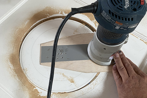 A 9 3/4-inch-diameter hole was routed to create the finish trim-out piece (left, right).