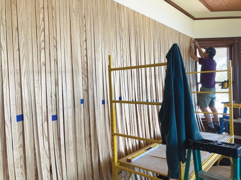 For help installing the wall covering, I contacted an old friend, Tim Sienkiewycz, a talented carpenter and furniture maker with some basket-making experience. In my shop, we mocked up a wall section to work out details and techniques. Before transporting the 2,400 lineal feet of milled material that I estimated we’d need, we finalized the color with the client and applied a quick-drying wiping stain called Woodsong II from M.L. Campbell (mlcampbell.com). For the warp, we used a golden oak stain; for the weft, we applied a darker, mission-oak mixture.