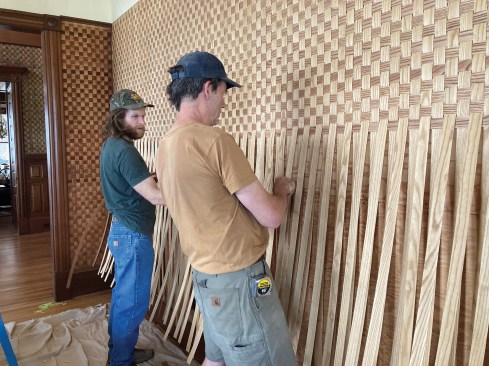 Back at the Pinnacle, we started by stapling the tops of the vertical strips to the substrate (mostly tongue-and-groove pine). Then we wove horizontal strips through the verticals, tapping them into place with small blocks and checking every third course or so with a string line to make sure that the strips were straight. As we wove, we were careful to hide splices behind the verticals, and stapled the verticals at every fourth or fifth course. Occasionally, a strip would break or splinter, in which case we’d snip out the damaged section and splice in a new strip. This was at least a two-person job, and for the parlor wall, Tim enlisted his son, Lee, to help out. Small trim strips at the top and just above the baseboard, along with a 1/2‑inch quarter round on each side, concealed the fasteners and helped secure the work to the wall.