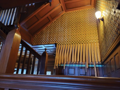 A few months after finishing the parlor wall, we returned to address a smaller section of wall in the main stairwell. In some ways, this part of the restoration was trickier, because the weft strips had been originally finished with a green stain that had faded over the years. We theorized that the color was created with an aniline dye manufactured by one of the original owner’s businesses (among other interests, Van Patten had become an expert in aniline dyes, and the company he worked for made a fortune for itself—and Van Patten—producing them). Here, we removed the original basket weave and replaced it. This time, instead of using veneer, I sawed the strips from 8/4 white ash, then used a wide-belt sander to bring the strips to finish size, as before.