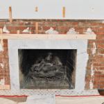 I attached the MDF to the backing with short square-drive screws and used longer screws to hit the studs across the top. I then installed the four pilasters and a quirk-and-bead around the marble slip, shown shimmed into place while the glue was setting.