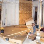 The plywood plates would provide nailing for the drywall and cement board to be installed on the wall. Once the top and bottom plywood plates were accurately positioned and fastened, we installed the curved steel plates over the plywood, through-bolting them to the floor framing. This gave us the surfaces onto which the iron studs would be welded.